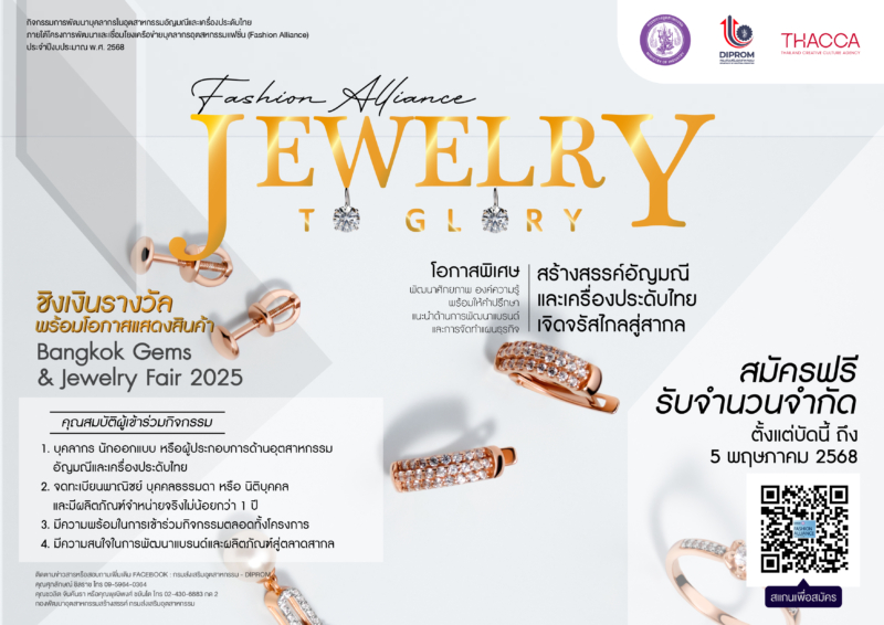 ขอเชิญผู้ประกอบการ SME นักออกแบบ และบุคลากรในอุตสาหกรรมอัญมณีและเครื่องประดับ สมัครเข้าร่วม “กิจกรรมการพัฒนาบุคลากรในอุตสาหกรรมอัญมณีและเครื่องประดับไทย (Fashion Alliance: Jewelry to Glory)” ภายใต้โครงการพัฒนาและเชื่อมโยงเครือข่ายบุคลากรอุตสาหกรรมแฟชั่น (Fashion Alliance) พร้อมรับสิทธิประโยชน์มากมาย อาทิ