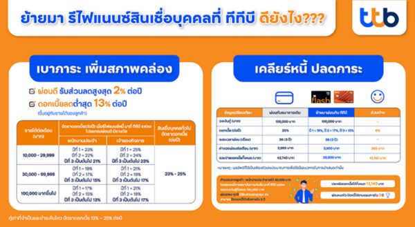 ทีทีบี ตอกย้ำแนวคิด “เปลี่ยนความเชื่อ…เพื่อชีวิตทางการเงินที่ดีขึ้น” ชวนลูกหนี้สินเชื่อส่วนบุคคลก้าวข้ามความกลัวและความเชื่อแบบผิด ๆ หยุดวงจรต้องทนจ่ายดอกเบี้ยแพง ทางเลือกใหม่สำหรับนักสู้ที่ไม่ยอมแพ้! เพื่อลดภาระหนี้ให้เบาลงช่วยให้หายใจได้โล่งขึ้น ด้วยการรีไฟแนนซ์สินเชื่อส่วนบุคคล มาที่บัตรกดเงินสดทีทีบี แฟลช กับโปรแกรมผ่อนดี…มีรางวัล จากทีทีบี ที่ให้ดอกเบี้ยเริ่มต้นเพียง 17% ต่อปี (ขึ้นอยู่กับรายได้ลูกค้า) และหากผ่อนดีต่อเนื่อง 12 เดือน ลดดอกเบี้ยให้อัตโนมัติอีก 2% ผ่อนดีต่ออีกปี ก็ลดดอกเบี้ยให้อีก 2% ต่อปี รวมอัตราดอกเบี้ยลดสูงสุดถึง 4% ต่อปี อยู่ที่ 13% ต่อปี โดยหากผู้กู้มีความตั้งใจจริงที่จะปลดหนี้ให้ได้ไว ทีทีบีพร้อมวางแผนให้จ่ายเพิ่มอีกเพียงเล็กน้อย เพื่อสามารถปิดหนี้ได้จริงภายใน 3 ปี (ภายใต้เงื่อนไขไม่มีหนี้ใหม่เพิ่ม) ให้คุณใช้ชีวิตทุกเดือนได้สบายใจมากยิ่งขึ้น ลดภาระหนี้ที่ต้องจ่ายต่อเดือน ปิดหนี้ได้เร็วขึ้น ช่วยให้ทุกคนสามารถเริ่มต้นเส้นทางชีวิตสู่การปลอดหนี้ สามารถผ่อนหนี้ได้ด้วยความสบายใจ ไม่ต้องกังวลเรื่องดอกเบี้ย อีกทั้งกระบวนการรีไฟแนนซ์กับทีทีบีนั้น ง่ายและไม่ยุ่งยาก ด้วยเจ้าหน้าที่ที่พร้อมให้คำปรึกษาและดูแลตลอดทุกขั้นตอน