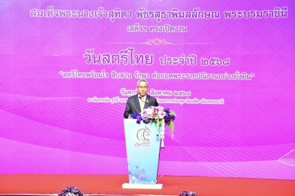 และในภาคบ่าย ได้รับพระมหากรุณาธิคุณจากสมเด็จพระนางเจ้าสุทิดา พัชรสุธาพิมลลักษณ พระบรมราชินี ทรงเสด็จพระราชดำเนินมาเป็นองค์ประธานในพิธีเปิดงานสตรีไทย ประจำปี 2568 ในนามของกระทรวง พม. ขอแสดงความยินดีกับทุกท่านที่ได้รับรางวัลตรีไทยดีเด่น ประจำปี 2568 รางวัลนี้เป็นการเชิดชูเกียรติสตรีไทยทุกท่าน นอกจากนี้ ขอขอบคุณสภาสมาคมสตรีแห่งชาติ ในพระบรมราชินูปถัมภ์ โดยการนำของสุกัญญา ประจวบเหมาะ ประธานสภาสมาคมสตรีแห่งชาติ ในพระบรมราชินูปถัมภ์ และหน่วยงานภาคีเครือข่ายทุกภาคส่วน ที่ร่วมกันจัดงานสตรีไทยในปีนี้