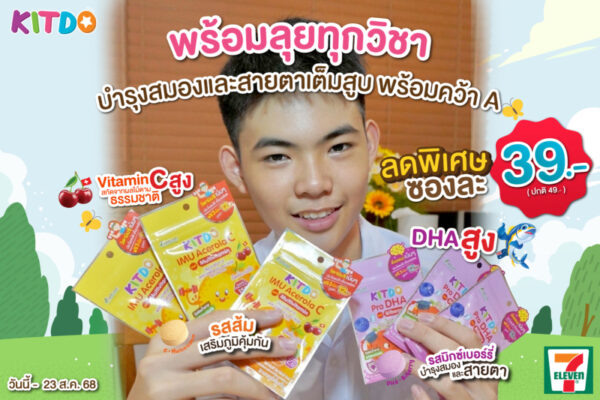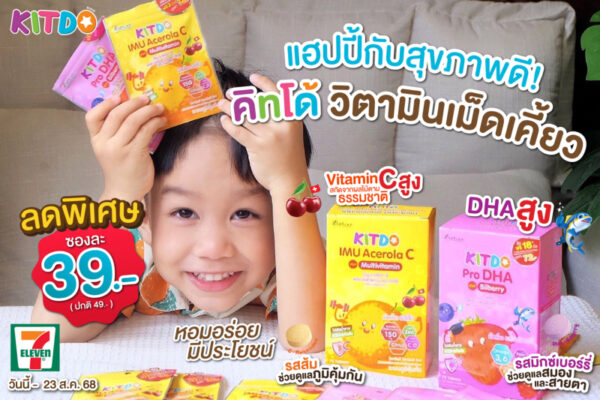 คิทโด้ (KITDO) วิตามินเม็ดเคี้ยวที่คุณพ่อคุณแม่เลือกสรรแล้วให้ลูกรัก เพราะคิทโด้เป็นวิตามินสูตรธรรมชาติ ไม่เติมน้ำตาล ไม่ใส่สารกันเสีย รสชาติหอมอร่อย ทานง่าย และอัดแน่นด้วยสารอาหารสำคัญ เพื่อเสริมสร้างพัฒนาการสำหรับหนูๆ น้องๆ ในช่วงเตรียมสอบ และยังดีต่อสุขภาพทุกคนในครอบครัว กลับมาพร้อมโปรโมชั่นราคาพิเศษ! พบกับ คิทโด้ วิตามินเม็ดเคี้ยว 2 สูตร 2 รสชาติ “คิทโด้ ไอมู อะเซโรลา ซี พลัส มัลติวิตามิน” สำหรับเสริมภูมิคุ้มกัน และ “คิทโด้ โปร ดีเอชเอ พลัส บิลเบอร์รี่” สำหรับบำรุงสมองและสายตา ในราคาเพียงซองละ 39 บาท (จากปกติ 49 บาท) พร้อมรับเพิ่มอีก 3 เม็ดในซองทันที (มูลค่า 12 บาท) รวมเป็น 15 เม็ด! พิเศษสำหรับสมาชิก All Member ลดเพิ่มอีก 1 บาท เหลือเพียง 38 บาท ตั้งแต่วันนี้ – 23 สิงหาคม 2568 ซื้อได้ที่เซเว่น อีเลฟเว่น ทุกสาขา