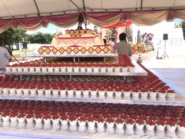 สำหรับปีนี้น้ำหนักเค้กรวมทั้งหมด 520 ปอนด์ เป็นคัพเค้ก 2,616 ชิ้น ปีนี้เค้กชิ้นใหญ่แต่งหน้าเค้กเป็นรูปพวงมาลัย และชั้นต่างๆตกแต่งด้วยคัพเค้กดอกไม้สีต่างๆ ที่ผมเปลี่ยนมาใช้คัพเค้กด้วย เพราะทุกปีที่ผ่านมาเวลาที่เราตัดเค้กใส่กล่อง เพื่อมอบให้กับแขกที่มาร่วมงาน รวมไปถึงพี่น้องและประชาชนทุกคน มักจะมีปัญหา เพราะเค้กชิ้นเล็กชิ้นใหญ่ไม่เท่ากัน เพราะเราช่วยกันตัดหลายคน บางทีหน้าเค้กก็เละไม่สวยงามน่ากิน พอเปลี่ยนมาเป็นคัพเค้กรู้สึกว่าสะดวกสบายและง่ายเวลาใส่กล่อง และเค้กทุกชิ้นก็ยังสวยงามครับ