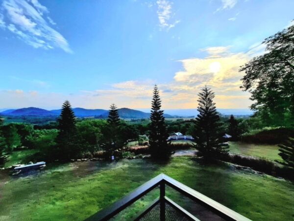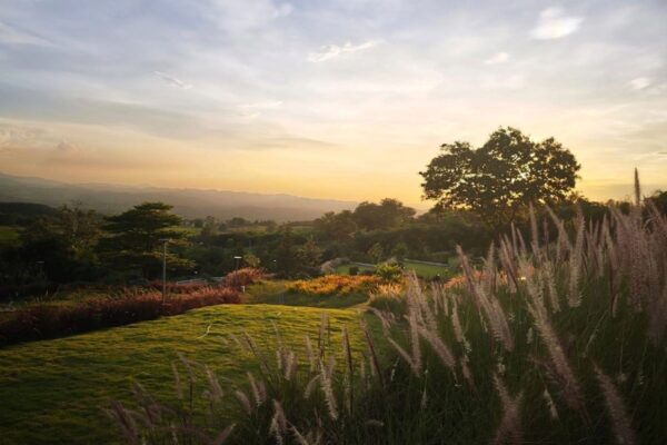 .. ตั้งแต่ล้อหมุนเข้าสู่ประตูรั้วทางเข้า “ ผาย้อนตะวัน “ ที่เราเห็นก็ทำให้เกิดอาการว้าว ! กันแล้ว กับหมู่มวลต้นมะขามที่ถูกปลูกจัดแต่งเรียงรายอย่างเป็นระเบียบ เว้นระยะกันอย่างน่ามอง ขณะที่ต้นหญ้าด้านล่างก็เขียวสดจนแทบอยากจะกระโดดลงไปนอนเกลือกกลิ้ง