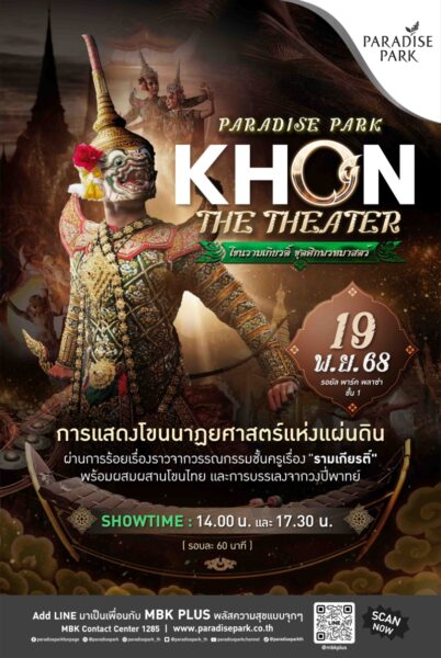มาร่วมเป็นส่วนหนึ่งในการสืบสานมรดกแห่งศิลปะการแสดงไทย และสัมผัสความภาคภูมิใจในศิลปวัฒนธรรมไทยพร้อมเก็บภาพความทรงจำสุดพิเศษ ที่งาน PARADISE PARK KHON THE THEATER ในวันพุธที่ 19 พฤศจิกายน 2568 ณ ชั้น 1 ลานรอยัลพาร์ค พลาซ่า ศูนย์การค้าพาราไดซ์ พาร์ค การแสดงออกเป็น 2 รอบ เวลา 14.00 น. และ 17.30 น. (รอบละ 60 นาที) ชมฟรีไม่มีค่าใช้จ่าย