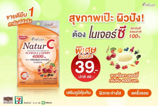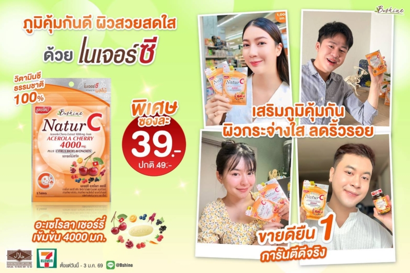 บริษัท บีไชน์ นูทริชั่น พลัส จำกัด จัดโปรโมชั่นต้อนรับลมหนาวด้วย “บีไชน์ เนเจอร์ซี สูตรใหม่” วิตามินซีธรรมชาติ 100% แบบซองพกพาสะดวก ขนาด 6 เม็ด ราคาพิเศษ เพื่อช่วยดูแลทุกคนให้สุขภาพดีและแข็งแรง เพียงซองละ 39 บาท (จากปกติ 49 บาท) และพิเศษยิ่งขึ้นสำหรับสมาชิก ALL member รับส่วนลดเพิ่มอีก 1 บาท ซื้อได้ตั้งแต่วันนี้ – 3 มกราคม 2569 ที่ร้านเซเว่น อีเลฟเว่น ทุกสาขาทั่วประเทศ