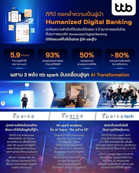 กรุงเทพฯ 17 ธันวาคม 2568 — ทีเอ็มบีธนชาต หรือ ทีทีบี ตอกย้ำความเป็นธนาคารแรกในไทยที่ประกาศแนวคิด Humanized Digital Banking – ดิจิทัลแบงก์กิ้งที่เป็นมิตร รู้จักและรู้ใจ ด้วยผลลัพธ์ที่จับต้องได้ตลอด 3 ปี ผ่านแอป ttb touch ที่ครองใจลูกค้ากว่า 5.9 ล้านราย และกว่า 50% ของการขายเกิดขึ้นผ่านช่องทางดิจิทัล พร้อมเปิดตัว 3 พลังขับเคลื่อนภายใต้ ttb spark เพื่อยกระดับประสบการณ์ลูกค้าและพนักงาน พร้อมเดินหน้าสู่ AI Transformation ทั่วทั้งองค์กรในปี 2569 ภายใต้เป้าหมายสูงสุด Make REAL Change เพื่อให้คนไทยมีชีวิตทางการเงินที่ดีขึ้นอย่างแท้จริง