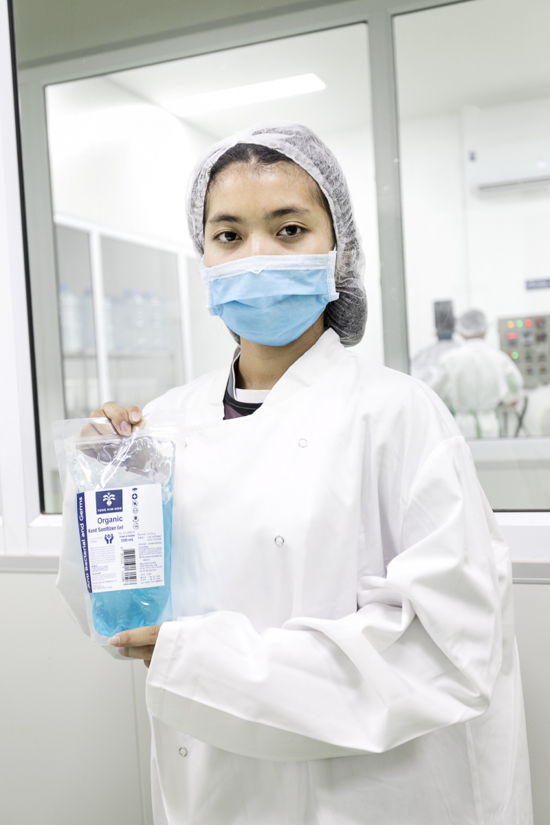 …เราทำมาสองเดือนแล้ว ตอนแรกเรานำไปบริจาคให้ที่โรงพยาบาลในเชียงใหม่ก่อน และเรามีโครงการที่จะนำไปบริจาคให้กับโรงพยาบาลที่จังหวัดเพชรบุรีและภูเก็ตอีกด้วย ซึ่งที่โรงพยาบาลมีความต้องการมาก แล้วยิ่งสถานการณ์ในวันนี้ทางโรงพยาบาลและหน่วยงานราชการก็สั่งผลิตเข้ามาก เราผลิตไม่เพียงพอกับความต้องการ ดังนั้นเราจะป้อนพื้นที่ที่มีความสำคัญก่อน แล้วหลังจากนั้นประชาชนทั่วไปก็สามารถซื้อหาเจลแอลกอฮอล์แบรนด์ยองฮิมฮูส์ได้ในราคาที่ไม่สูง เพราะอยากจะให้ทุกคนสามารถได้ใช้เหมือนกันหมด