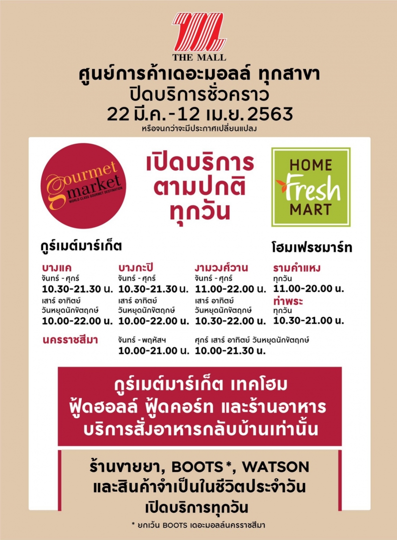บริษัท เดอะมอลล์ กรุ๊ป จำกัด ยินดีให้ความร่วมมือและร่วมรับผิดชอบต่อสังคม ด้วยการมีส่วนร่วมในการลดความเสี่ยงการแพร่ระบาดโรคติดเชื้อไวรัสโควิด-19 ในวงกว้าง ด้วยการปฏิบัติตามประกาศกรุงเทพมหานคร,จังหวัดนครราชสีมา และจังหวัดนนทบุรี ในการปิดพื้นที่ศูนย์การค้าและห้างสรรพสินค้าเดอะมอลล์ ทุกสาขา, ดิ เอ็มโพเรี่ยม, ดิ เอ็มควอเทียร์ และพารากอน เป็นการชั่วคราว ตั้งแต่วันที่ 22 มีนาคม 2563 จนถึง 12 เมษายน 2563 ทั้งนี้ยกเว้นซูเปอร์มาร์เก็ต ศูนย์อาหาร ร้านอาหาร และธุรกิจบางประเภทที่จำเป็นต่อการดำรงชีวิต ตามรายละเอียดดังนี้