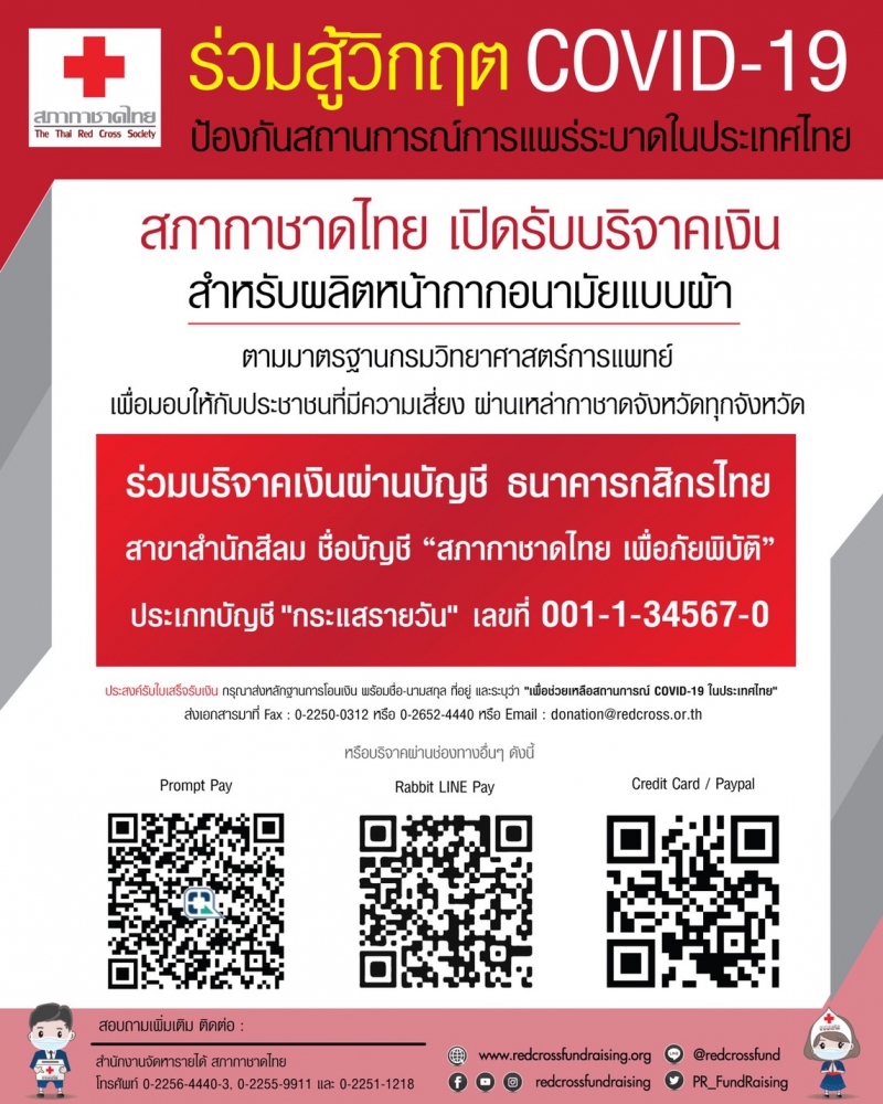 ทั้งนี้ สภากาชาดไทย จึงขอเชิญประชาชนร่วมเป็นส่วนหนึ่งในการป้องกันและลดความเสี่ยงการแพร่ระบาดของโรคติดเชื้อไวรัสโคโรนา 2019 (COVID-19) ด้วยการบริจาคเงินสมทบทุนการจัดทำหน้ากากอนามัยแบบผ้า โดยโอนเงินผ่านบัญชีธนาคารกสิกรไทย สาขาสำนักสีลม ชื่อบัญชี ” สภากาชาดไทย เพื่อภัยพิบัติ” ประเภทบัญชี “กระแสรายวัน” เลขที่ 001-1-34567-0 โดยขอรับใบเสร็จรับเงินเพื่อนำไปลดหย่อนภาษีได้ที่ [email protected] พร้อมแจ้งชื่อ-นามสกุล ที่อยู่ในการจัดส่งใบเสร็จ และเบอร์โทรศัพท์ แนบหลักฐานการโอนเงิน พร้อมระบุ “เพื่อช่วยเหลือสถานการณ์ COVID-19 ในประเทศไทย”