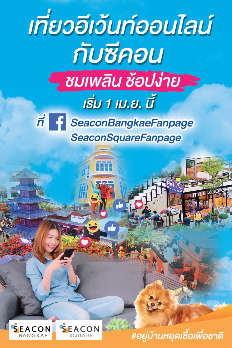 ชม ช้อป อีเว้นท์ออนไลน์ สบายใจปลอดภัยที่บ้าน กับแคมเปญ “เที่ยวอีเว้นท์ออนไลน์กับซีคอน” ในบรรยากาศอยู่บ้าน หยุดเชื้อ เพื่อชาติ ได้ตั้งแต่วันที่ 1 เมษายน 63 เป็นต้นไป พร้อมกันทั้ง 2 สาขา ที่เฟสบุ๊คแฟนเพจ www.facebook.com/SeaconSquareFanPage และ www.facebook.com/ SeaconBangkaeFanPage สอบถามข้อมูลเพิ่มเติม ซีคอนสแควร์ โทร. 0-2721-8888 ซีคอน บางแค โทร 02-454-7777