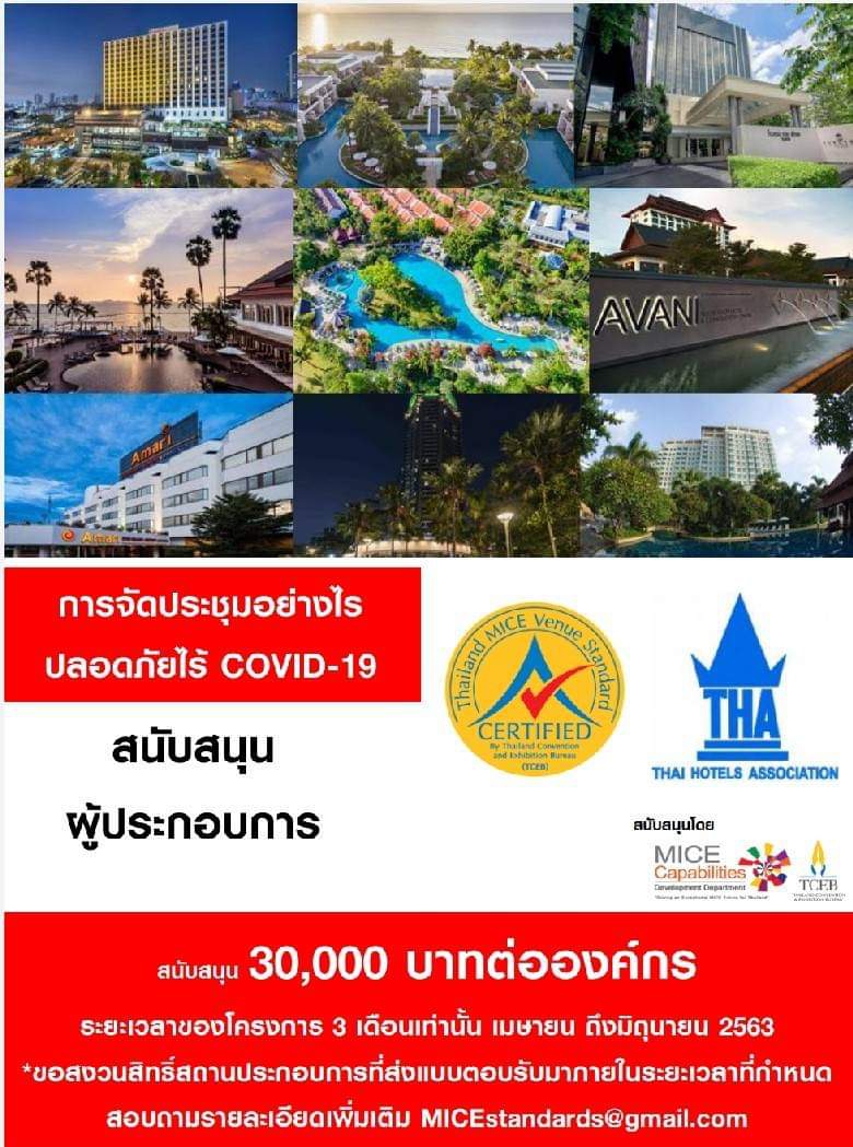 โครงการแรก “จัดประชุมอย่างไร ปลอดภัยไร้ COVID-19” ให้การสนับสนุนงบประมาณ 30,000 บาท สำหรับสถานประกอบการไมซ์ โดยมีวัตถุประสงค์เพื่อให้ผู้ประกอบการนำไปจัดทำแผน และจัดหาอุปกรณ์ตามมาตรการคัดกรองและป้องกันไวรัสโควิด-19 ตามแนวปฏิบัติควบคุมและป้องกันไวรัสโควิด-19 ของกระทรวงสาธารณสุข เพื่อนำมาปฏิบัติใช้ในสถานที่จัดงานและสร้างความมั่นใจให้แก่ผู้มาใช้บริการ อาทิ การติดตั้งอุปกรณ์ตรวจวัดอุณหภูมิ การตรวจวัดอุณหภูมิร่างกายก่อนเข้าร่วมงาน การตรวจประวัติของผู้ที่เข้ามาร่วมงาน การติดตั้งจุดล้างมือ จุดบริการแอลกอฮอล์ และการเว้นระยะห่างทางสังคม เป็นต้น