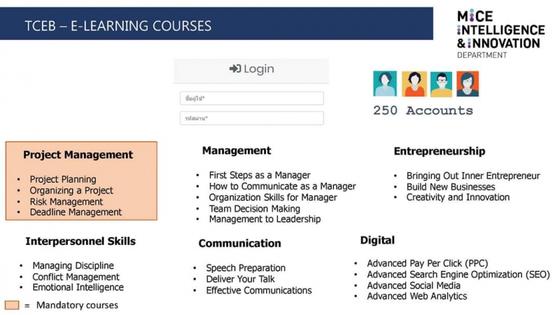 E-Learning Platform หรือศูนย์การเรียนรู้คอร์สฝึกอบรมออนไลน์สำหรับผู้ประกอบการไมซ์ เพื่อเพิ่มทักษะและทบทวนความรู้ (Upskills and Reskills) ที่สามารถนำไปประยุกต์ใช้ในการทำงานได้ในช่วงที่งานได้รับผลกระทบ สามารถรองรับการทำงานที่ปฏิบัติจริงได้ทันที และเตรียมความพร้อมปูพื้นฐานการใช้เทคโนโลยีสำหรับผู้ประกอบการไมซ์ได้อย่างมีประสิทธิภาพ โดยทีเส็บเปิดรับสมัครผู้ประกอบการไมซ์ที่สนใจจำนวน 250 ราย เข้าเรียนคอร์สฝึกอบรมออนไลน์ ผ่านแพลตฟอร์ม YourNextU จากสถาบัน Southeast Asia Center หรือ SEAC รวมทั้งสิ้น 6 หลักสูตร ได้แก่ 1. หลักสูตรการบริหารโครงการ (Project Management) 2. หลักสูตรทักษะความสัมพันธ์ระหว่างบุคคล (Interpersonnel Skills) 3. หลักสูตรการจัดการ (Management) 4. หลักสูตรการสื่อสาร (Communication) 5. หลักสูตรความเป็นผู้ประกอบการ (Entrepreneurship) และ 6. หลักสูตรการใช้ดิจิตอล (Digital) ซึ่งกำหนดระยะเวลาเรียนออนไลน์ 6 เดือน ตั้งแต่เดือนพฤษภาคม-ตุลาคม 2563 โดยผู้เข้าเรียนจะได้รับประกาศนียบัตรรับรองจากทีเส็บ หากเรียนรายวิชาครบตามที่กำหนด
