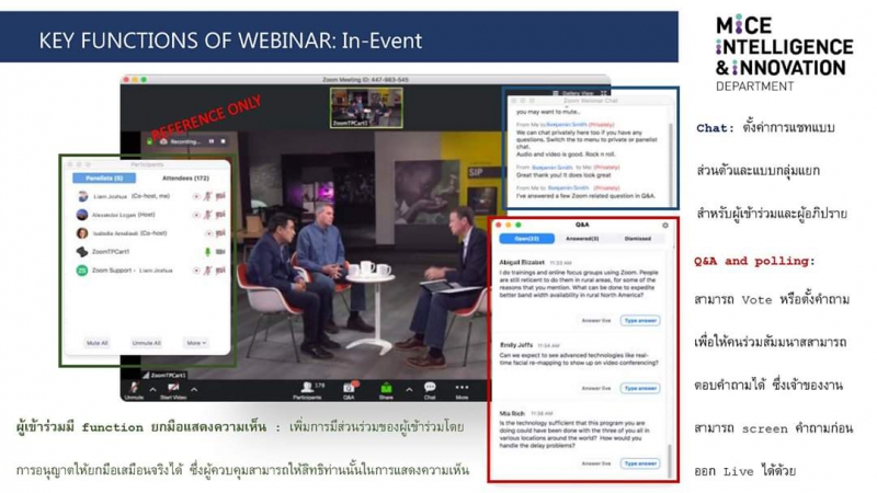 Webinar หรือ การประชุมสัมมนาเสมือนจริงผ่านระบบออนไลน์ ให้การสนับสนุนการจัดหาและบริหารจัดการแพลทฟอร์มออนไลน์ สำหรับผู้จัดงานและผู้ประกอบการไมซ์ที่ต้องการจัดประชุมสัมมนา ปรับเปลี่ยนมาใช้การจัดประชุมสัมมนาผ่านระบบออนไลน์ โดยทีเส็บจะดำเนินการด้านบริหารจัดการเรื่องการผลิต และการจัดเตรียมสตูดิโอสำหรับการไลฟ์ (LIVE) ให้กับผู้จัดงาน รวมถึงการจัดเตรียมผู้ประสานงานทางเทคนิค การดูแลระบบระหว่างการไลฟ์ (LIVE) ซึ่งผู้จัดงานสามารถนำเสนอสไลด์ดิจิทัล (Slide Presentation) ขึ้นโชว์ควบคู่ไปพร้อมกับการประชุมสัมมนาหรือการพูดคุยได้ในเวลาเดียวกัน การแชร์ประสบการณ์ การพูดคุยร่วมกับวิทยากร การสอบถามแบบยกมือแสดงความคิดเห็น ตลอดจนการทำโพลแบบสำรวจ โดยรองรับผู้เข้าร่วมประชุมได้สูงสุดถึง 10,000 คนต่องาน