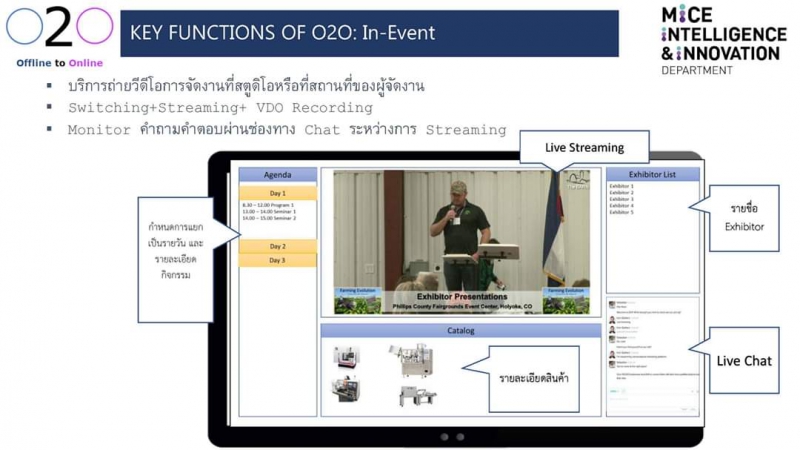 O2O (Offline to Online) หรือ การจัดงานแสดงสินค้าผ่านระบบออนไลน์ ให้การสนับสนุนการจัดหาและบริหารจัดการแพลทฟอร์มออนไลน์สำหรับผู้จัดงานแสดงสินค้า โดยสนับสนุนการถ่ายทอดสดผ่านไลฟ์สตรีมมิ่งทั้งจากสตูดิโอหรือสถานที่ของผู้จัดงาน ครอบคลุมทั้งการร่วมวางคิว ผลิต ควบคุม และดูแลระบบระหว่างการถ่ายทอดสดผ่านไลฟ์สตรีมมิ่ง รวมถึงจัดเตรียมผู้ประสานงานทางเทคนิคให้แก่ผู้จัดงานแสดงสินค้าในทุกขั้นตอน ซึ่งผู้ร่วมแสดงสินค้าจะสามารถนำเสนอกิจกรรมและสินค้าบริการต่างๆ รวมถึงมีระบบการชำระเงินออนไลน์ที่สามารถเพิ่มยอดขายให้แก่ธุรกิจได้อีกด้วย