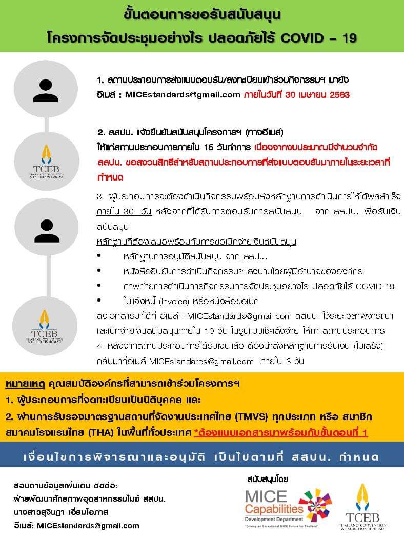 “ผลจากการระบาดของโควิด-19 ทำให้เกิดการยกเลิกงานไมซ์ทั่วโลก ทำให้การประชุมออนไลน์ การแสดงสินค้าออนไลน์เริ่มเข้ามามีบทบาทสำคัญในการอยู่รอดของธุรกิจ ซึ่งผู้ประกอบการของไทยเองต้องปรับตัวให้ทัน ดังนั้น ทีเส็บจึงเข้ามาดำเนินการเพื่อเสริมมาตรการของรัฐบาล มุ่งเน้นการเตรียมความพร้อมมาตรฐานสถานที่จัดงานและผู้ประกอบการไมซ์ ได้แก่ การส่งเสริมมาตรฐานความปลอดภัย และการส่งเสริมการจัดงานโดยใช้เทคโนโลยีออนไลน์ จำนวน 2 โครงการในระยะแรกนี้”