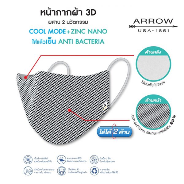 ผลิตภัณฑ์เครื่องแต่งกาย ARROW ร่วมเป็นส่วนหนึ่งเพื่อแก้ไขปัญหาการแพร่ระบาดของโรคโควิด-19 จึงผลิต “หน้ากากผ้า 3D ARROW” ใส่ได้ 2 ด้าน ผสานนวัตกรรมสุดล้ำ ด้านหน้า ZINC NANO ที่มาพร้อมคุณสมบัติพิศษ ANTI BACTERIA ได้ถึง 99% และ ด้านหลัง COOL MODE ใส่แล้วเย็น ผลิตจากเนื้อผ้านาโนซิงค์ ระบายอากาศได้ดี หายใจสะดวก ช่วยปัองกันฝุ่นละอองและการกระจายจากการไอหรือจาม ดีไซน์แบบ 3D กระชับพอดีกับรูปหน้า สามารถซักและนำกลับมาใช้ซ้ำได้ พิเศษ 2 ชิ้น เพียง 299 บาท จำหน่ายที่ : Ethailandbest : https://bit.ly/2ympK4w SHOPPEE : https://bitly/3ckq6Hw LAZADA : https://bitly/2Kipeag