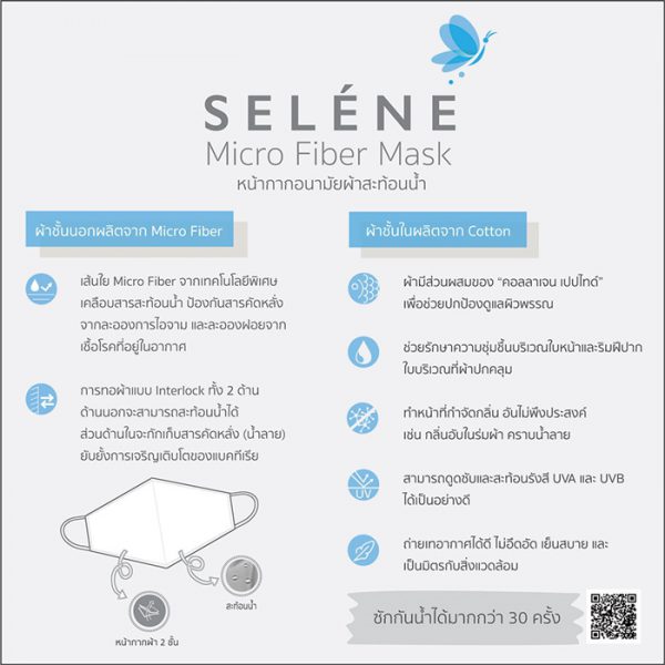 โครงการ Selene Mask #รวมใจ #สู้ภัยโควิด เป็นโครงการที่จัดขึ้นโดยแบรนด์ของ Selene โดยมีวัตถุประสงค์ที่ต้องการให้ประชาชนทั่วไปได้มีหน้ากากผ้าคุณภาพดีสำหรับใช้ในชีวิตประจำวัน และยังได้รับประกันโควิด-19 กับประกันอุบัติเหตุ อีกทั้งยังได้ร่วมสมทบทุนเพื่อมอบเงินและอุปกรณ์ที่จำเป็นให้กับบุคลากรทางการแพทย์และโรงพยาบาลอีกด้วยสิทธิพิเศษสำหรับท่านที่ซื้อหน้ากากผ่านทางโครงการในราคาพิเศษมูลค่า 100 บาท (จากปกติราคา 180 บาท) – ได้รับหน้ากากผ้า Selene Mask รุ่นพิเศษ 1 ชิ้น ที่มีคุณสมบัติสะท้อนน้ำ เทคโนโลยีผ้าคอลลาเจนเพื่อเพิ่มความชุ่มชื้น ลดกลิ่นอับและแบคทีเรีย – ได้ร่วมสมทบทุนให้โรงพยาบาล – ได้รับได้รับประกันโควิด-19 และประกันอุบัติเหตุ โดยโครงการนี้จะเริ่มตั้งแต่วันที่ 1 พฤษภาคม – 31 กรกฏาคม 2563 นี้ และจะมีการนำรายได้จากการลงทะเบียนหลังจากหักค่าใช้จ่าย ไปมอบให้กับโรงพยาบาล เพื่อนำไปซื้ออุปกรณ์ป้องกันเชื้อโรค ให้กับแพทย์และพยาบาลต่อไป ผู้ที่สนใจลงทะเบียนได้ที่ https://forms.gle/oVtgK2VSJpN1g8zF7 เกี่ยวกับหน้ากาก Selene Mask รุ่นพิเศษ ด้านหน้าใช้ผ้าสะท้อนน้ำแบบพิเศษ เพื่อความปลอดภัย สามารถกันน้ำและสารคัดหลั่งต่าง ๆ ได้อย่างดีเยี่ยม ผ้าด้านในใช้ผ้าเทคโนโลยีพิเศษผสมคอลลาเจน เพื่อเพิ่มความชุ่มชื้น ลดกลิ่นอับและยับยั้งแบคทีเรีย อีกทั้งยังเป็นหน้ากากผ้าที่สามารถซักและนำมาใช้ใหม่ได้มากถึง 30 ครั้ง
