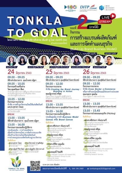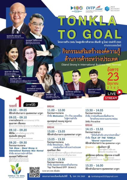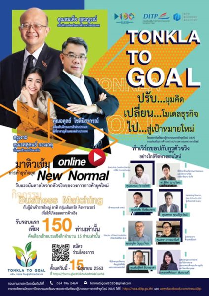 กรมส่งเสริมการค้าระหว่างประเทศ ขอเชิญชวนผู้ประกอบการ SMEs ไทย (ภาคใต้) “ปรับมุมคิด เปลี่ยนโมเดลธุรกิจ ไปสู่เป้าหมายใหม่” ในเวทีการค้าโลก กับโครงการ TONKLA TO GOAL (ต้นกล้าทูโกล) ซึ่งผู้ประกอบการจะได้ร่วมติวเข้มกับกูรูตัวจริง พร้อมพบผู้นำเข้ารายใหญ่ อาทิ กลุ่มเซ็นทรัล และคิงพาวเวอร์ ผ่านระบบออนไลน์ (online) ตามแนวความคิดการทำธุรกิจยุควิถีใหม่ (New Normal) ซึ่งโครงการนี้แบ่งออกเป็น 3 ระยะ โดยจะเพิ่มความเข้มข้นเจาะลึกเนื้อหา พร้อมแนะแนวทางปฏิบัติที่จะทำให้ผู้ประกอบการขายสินค้าได้จริง!!!