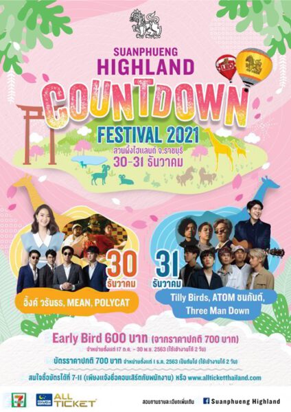 สนใจซื้อบัตรได้ที่ 7-11 (เพียงแจ้งชื่อคอนเสิร์ตกับพนักงาน) หรือ www.allticketthailand.com ***เริ่มขายบัตร Early Bird ระหว่างวันที่ 17 ตุลาคม – 30 พฤศจิกายน ในราคาเพียง 600 บาท (จากราคาปกติ 700 บาท) และจำหน่ายบัตรราคาปกติ 700 บาท ตั้งแต่ 1 ธันวาคม เป็นต้นไป ซึ่งสามารถเข้างานได้ทั้ง 2 วัน สอบถามรายละเอียดเพิ่มเติม Facebook : Suanphueng Highland
