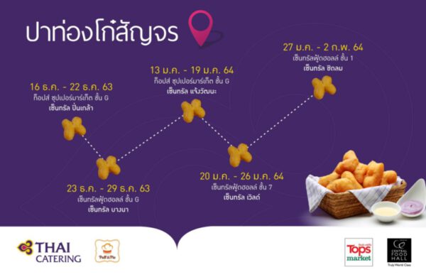 นางวรางคณา ลือโรจน์วงค์ กรรมการผู้จัดการฝ่ายครัวการบิน บริษัท การบินไทย จำกัด (มหาชน) เปิดเผยว่า ปาท่องโก๋การบินไทย ยังได้รับการตอบรับจากลูกค้าเป็นอย่างดี นอกจากสาขาร้านปัจจุบันที่ยังเปิดจำหน่ายปกติ และขยายเวลาจำหน่ายแล้ว ฝ่ายครัวการบิน การบินไทย ยังได้นำไปทอดจำหน่ายตามห้างสรรพสินค้าชั้นนำต่างๆ เพื่อตอบสนองความต้องการของลูกค้าอย่างทั่วถึง ตลอดเดือนกุมภาพันธ์ และมีนาคม 2564 อาทิ ท็อปส์ซุปเปอร์มาร์เก็ต ในห้างสรรพสินค้าเซ็นทรัลพระราม 3 เซ็นทรัลพลาซ่าเวตส์เกต เซ็นทรัลลาดพร้าว เซ็นทรัลรัตนาธิเบศร์ โรบินสันฟิวเจอร์ปาร์ครังสิต โรบินสันแฟชั่นไอร์แลนด์ ท็อปส์ซุปเปอร์มาร์เก็ตสุขาภิบาล 3 และเปิดจุดขายเพิ่มตามสาขาต่างจังหวัดทั้ง เชียงใหม่ ภูเก็ต กระบี่ รวมถึงเพิ่มช่องทางการจำหน่ายผ่าน delivery services ที่โทร. 02-356-1666
