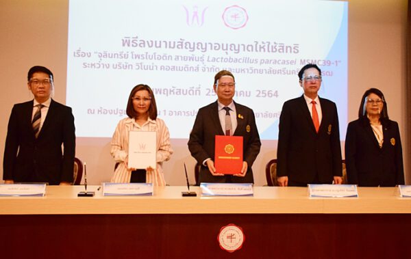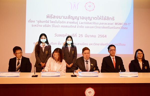 (25 มีนาคม 2564) มหาวิทยาลัยศรีนครินทรวิโรฒ (มศว) และ วิโนน่า ร่วมลงนามสัญญาอนุญาตใช้สิทธิข้อมูลเทคโนโลยี จุลินทรีย์ โพรไบโอติก สายพันธุ์ Lactobacillus paracasei MSMC39-1 เพื่อประโยชน์เชิงพาณิชย์ สำหรับงานวิจัยพัฒนาผลิตภัณฑ์หรือนวัตกรรมสนับสนุนภาคธุรกิจ ต่อยอดผลิตภัณฑ์อุตสาหกรรมอาหารและอาหารเสริมเพื่อสุขภาพที่มีการเติบโตเพิ่มสูงขึ้น โดยปี 2560 – 2563 มูลค่าตลาดของผลิตภัณฑ์โพรไบโอติกในอาเซียน มีการเติบโตมากกว่า 300 เปอร์เซ็นต์