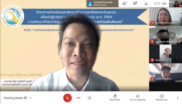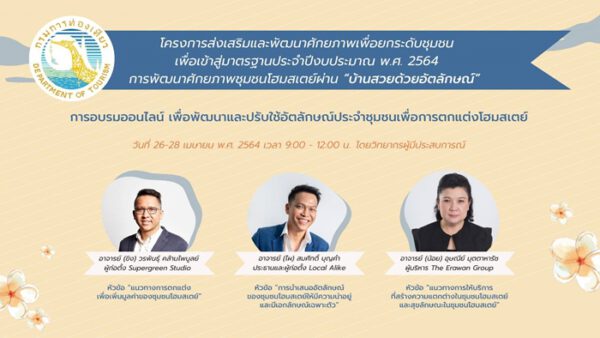 เมื่อวันที่ ๒๖ เมษายน ๒๕๖๔ ที่ผ่านมา นางสาววรธีรา สุวรรณศร ผู้อำนวยการกองพัฒนาบริการท่องเที่ยว เปิดการอบรมโครงการส่งเสริมและพัฒนาศักยภาพเพื่อยกระดับชุมชนเพื่อเข้าสู่มาตรฐานประจำปีงบประมาณ พ.ศ. ๒๕๖๔ ผ่านกิจกรรมการพัฒนาศักยภาพชุมชนโฮมสเตย์ผ่าน “บ้านสวยด้วยอัตลักษณ์” ในรูปแบบออนไลน์ ซึ่งจัดอบรมระหว่างวันที่ ๒๖ – ๒๘ เมษายน ๒๕๖๔ มีชุมชนที่เข้าร่วมอบรมกว่า ๓๕ ชุมชน