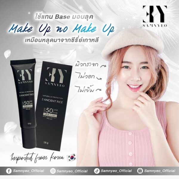 และเป็นที่มาของชื่อแบรนด์ Samnyeo ซึ่งแปลว่าผู้หญิง 3 คน เป็นครีมกันแดดที่สามารถใช้ได้ทุกคนจริง หญิง/ชาย ผิวหน้าสภาพไหนใช้ได้ทั้งหมด ไม่มีสารอันตราย ไม่ต้องกังวลว่าจะแพ้ เพราะส่วนผสมหลักคือ ข้าวจักรพรรดิ(Godaemi) ที่นำเข้ามาจากเกาหลีแท้ๆ ซึ่งส่วนใหญ่นิยมใช้กับสกินแคร์ และนี่เป็นครั้งแรกที่นำมาใช้กับกันแดดได้อย่างลงตัว