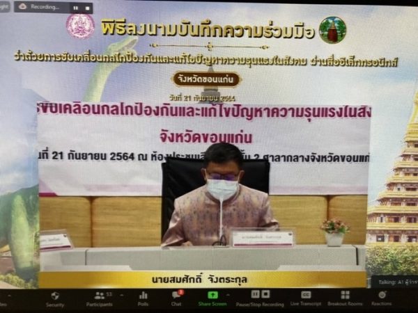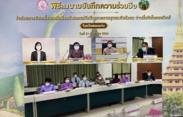วันนี้ (21 ก.ย. 64) เวลา 09.30 น. นางพัชรี อาระยะกุล ปลัดกระทรวงการพัฒนาสังคมและความมั่นคงของมนุษย์ เป็นประธานในพิธีลงนามบันทึกความร่วมมือ (MOU) ว่าด้วยการขับเคลื่อนกลไกป้องกันและแก้ไขปัญหาความรุนแรงในสังคม นำร่อง 3 จังหวัด ได้แก่ จังหวัดชุมพร ขอนแก่น และร้อยเอ็ด รวมทั้งสิ้น 39 หน่วยงาน ผ่านสื่ออิเล็กทรอนิกส์ เพื่อสนับสนุนแนวทางการทำงานในทุกมิติสำหรับการปฏิบัติงานอย่างเป็นระบบที่ชัดเจน และส่งเสริมการบูรณาการความร่วมมือระหว่างหน่วยงานในพื้นที่ที่เกี่ยวข้องในทุกระดับ เป็นทีมสหวิชาชีพ โดยมีกรอบและข้อเสนอแนวทางการดำเนินงานกลไกขับเคลื่อนการป้องกันและแก้ไขปัญหาความรุนแรงในสังคม ตามกลยุทธ์ 5Ps ประกอบด้วย ด้านนโยบาย ด้านการดำเนินคดี ด้านการคุ้มครอง ด้านการป้องกัน และด้านความร่วมมือ