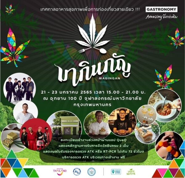 กิจกรรม “มากินกัญ” เทศกาลอาหารสุขภาพ ภายใต้โครงการ Gastronomy Amazing ยิ่งกว่าเดิม จัดขึ้น ระหว่างวันที่ 21-23 มกราคม 2565 ตั้งแต่เวลา 15.00-21.00 น. ณ อุทยาน 100 ปี จุฬาลงกรณ์มหาวิทยาลัย กรุงเทพมหานคร ททท. ได้หยิบยกกระแสความสนใจ “กัญชา-กัญชง” เทรนด์อาหารที่มาแรงที่สุดในยุคนี้ ซึ่งเป็นพืชสมุนไพรท้องถิ่นที่ได้รับอนุญาตตามข้อบัญญัติของกฎหมายมานำเสนอเป็นสินค้าและบริการการท่องเที่ยว โดยต่อยอดจากองค์ความรู้และคุณค่าของอาหารพื้นบ้านที่มีคุณค่าด้านรสชาติและเอกลักษณ์แห่งความเป็นไทย จากพืชผักสมุนไพรท้องถิ่น ซึ่งมีสรรพคุณทางยามาผสมผสานและรังสรรค์เป็นอาหารเพื่อสุขภาพ เครื่องดื่ม และผลิตภัณฑ์สุขภาพ รวมถึงพืชผักสมุนไพรท้องถิ่นที่มีความเชื่อมโยงกับชุมชน สะท้อนถึงวิถีชีวิต และภูมิปัญญาไทยที่มีความสอดคล้องกับแนวคิด BCG Economy Model ซึ่งจะเป็นการผลักดันและยกระดับสินค้าการท่องเที่ยวของประเทศไทยให้มีคุณภาพเทียบเท่าระดับมาตรฐานนานาชาติ ไม่เพียงเท่านั้น ยังสามารถนำมาต่อยอดส่งเสริมการท่องเที่ยวเชิงสุขภาพ (Health & Wellness) ออกแบบเส้นทางท่องเที่ยวศึกษาเรียนรู้ กัญชา-กัญชง ได้อีกด้วย
